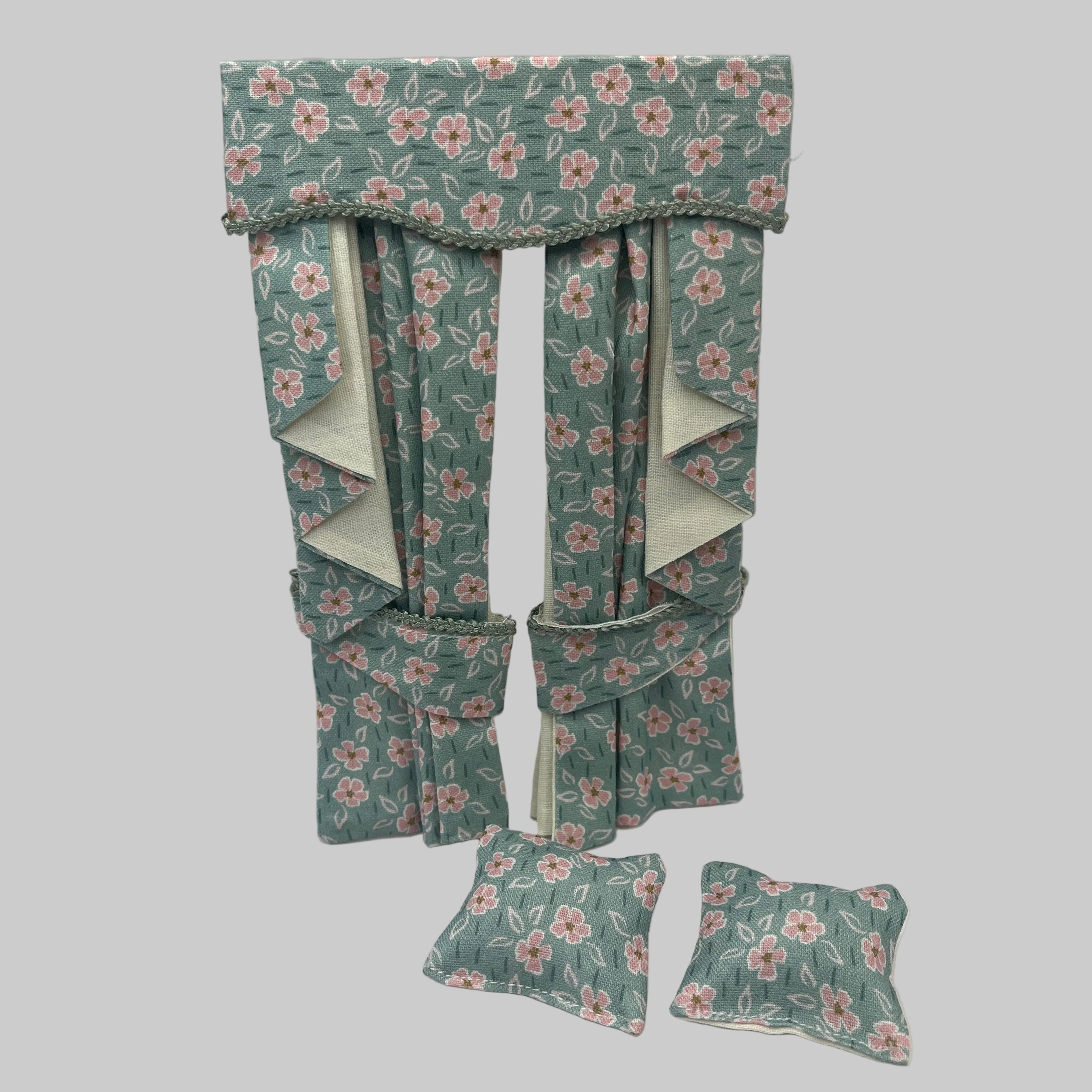 Transform your dolls house windows with these sumptuous curtains, complete with co-ordinating cushions that bring instant elegance to every room. Crafted in premium fabrics with meticulous attention to detail, this set captures the luxury of full-scale interior design at 1:12 scale.