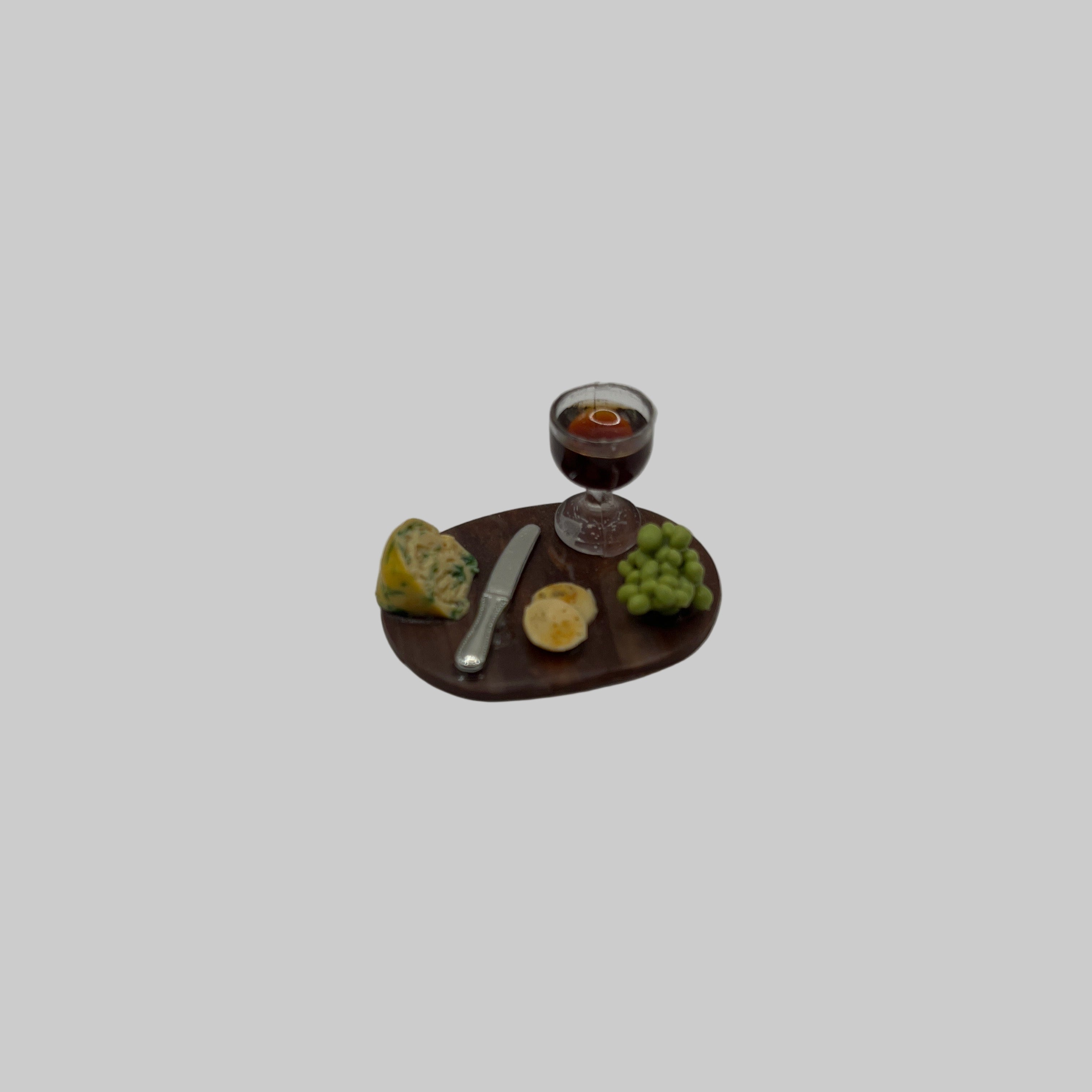 Delight in miniature charm with this cheese and wine board featuring a classic chunk of stilton. Perfect for adding a touch of tempting elegance to your dolls house, this tiny treat sparks style in every detail.