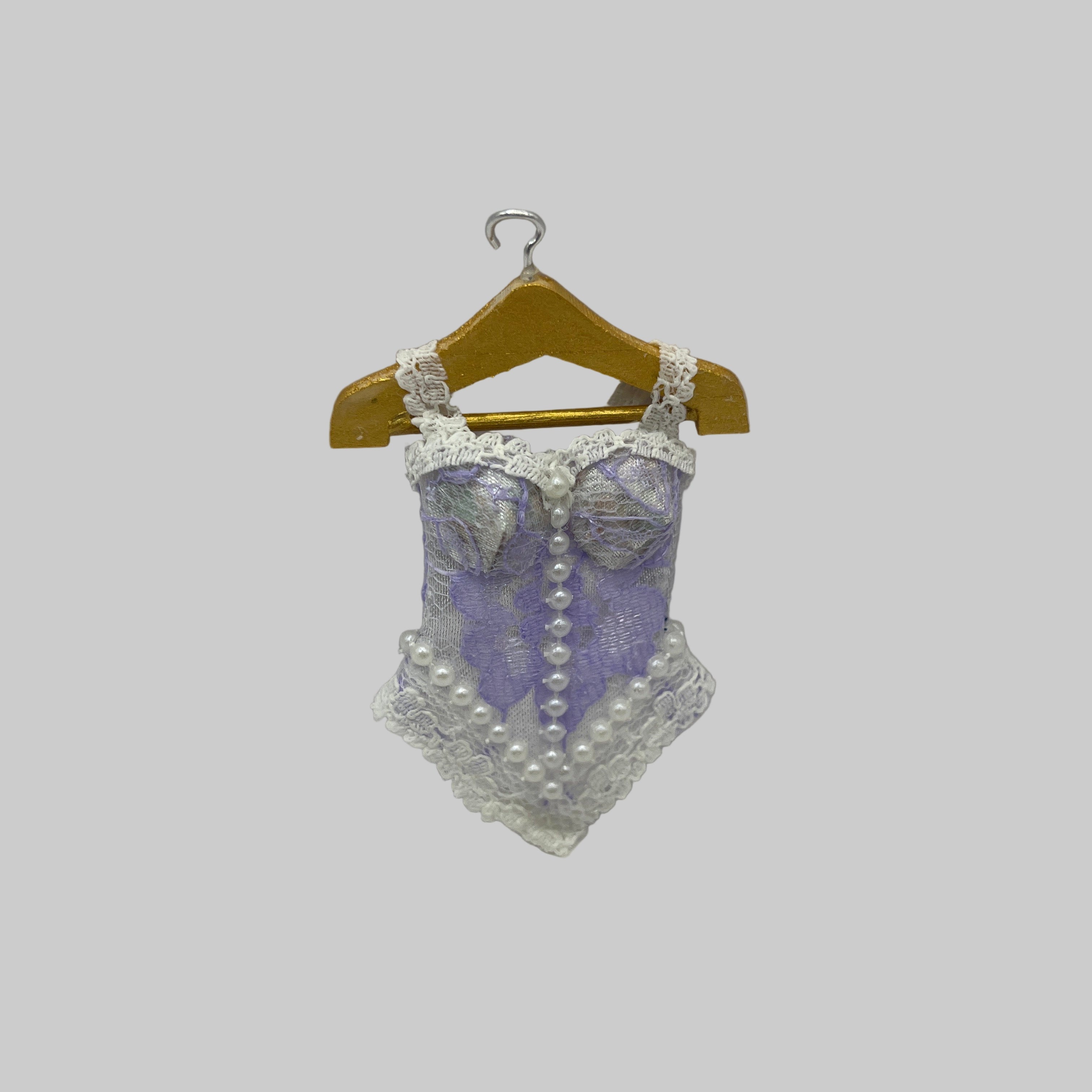 Add a touch of vintage charm to your dolls house wardrobe or shop scene with this lilac lace corset. Delicately crafted to fit miniature figures, it blends intricate lace detail with a soft pastel hue for a sweet, Victorian-inspired look. Perfect for dolls house fashionistas looking to elevate their style with an elegant accessory.
