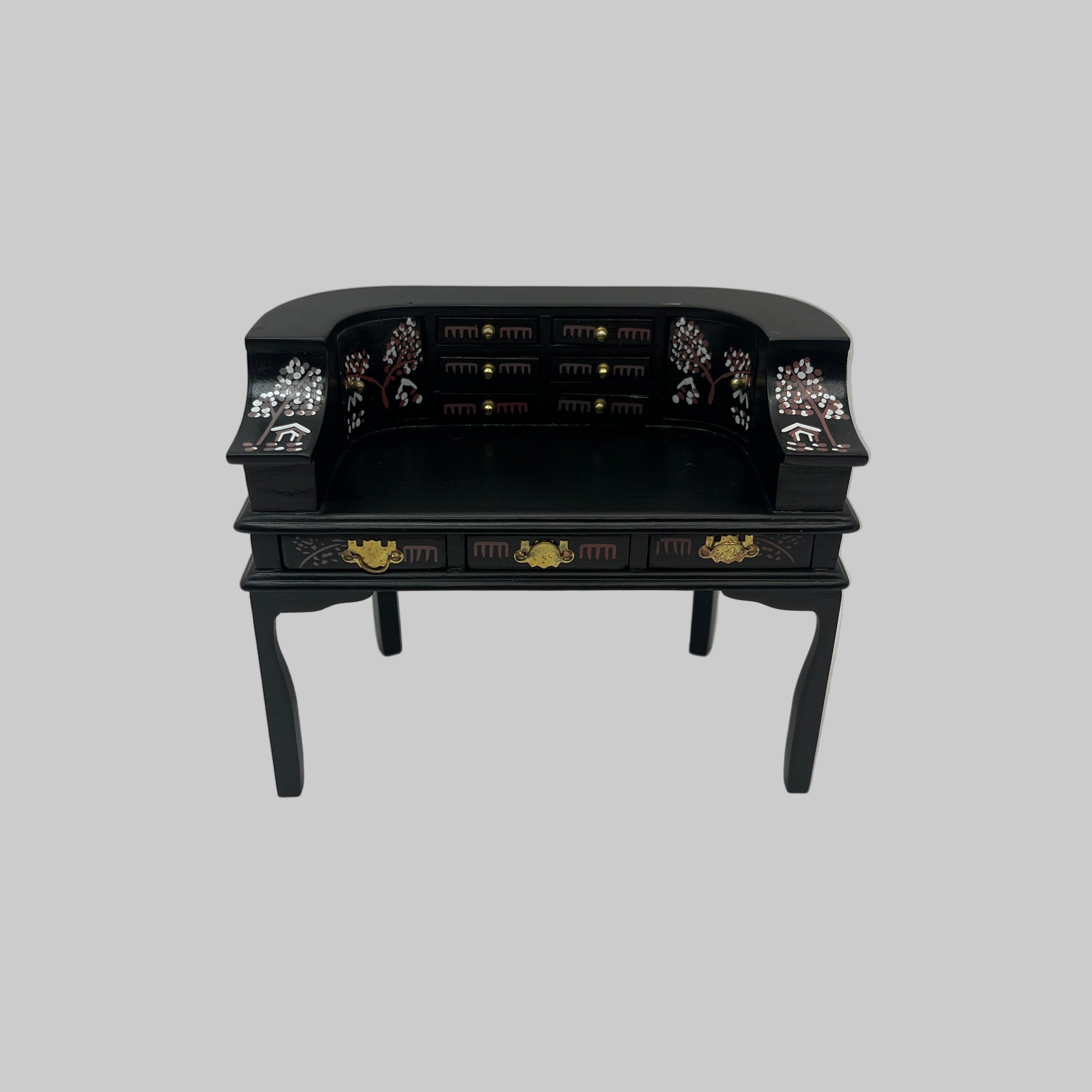 Bring a touch of exotic charm to your dolls house with this Oriental curved desk. Its elegant design invites miniature creativity and adds a stylish twist to any tiny study or office scene.