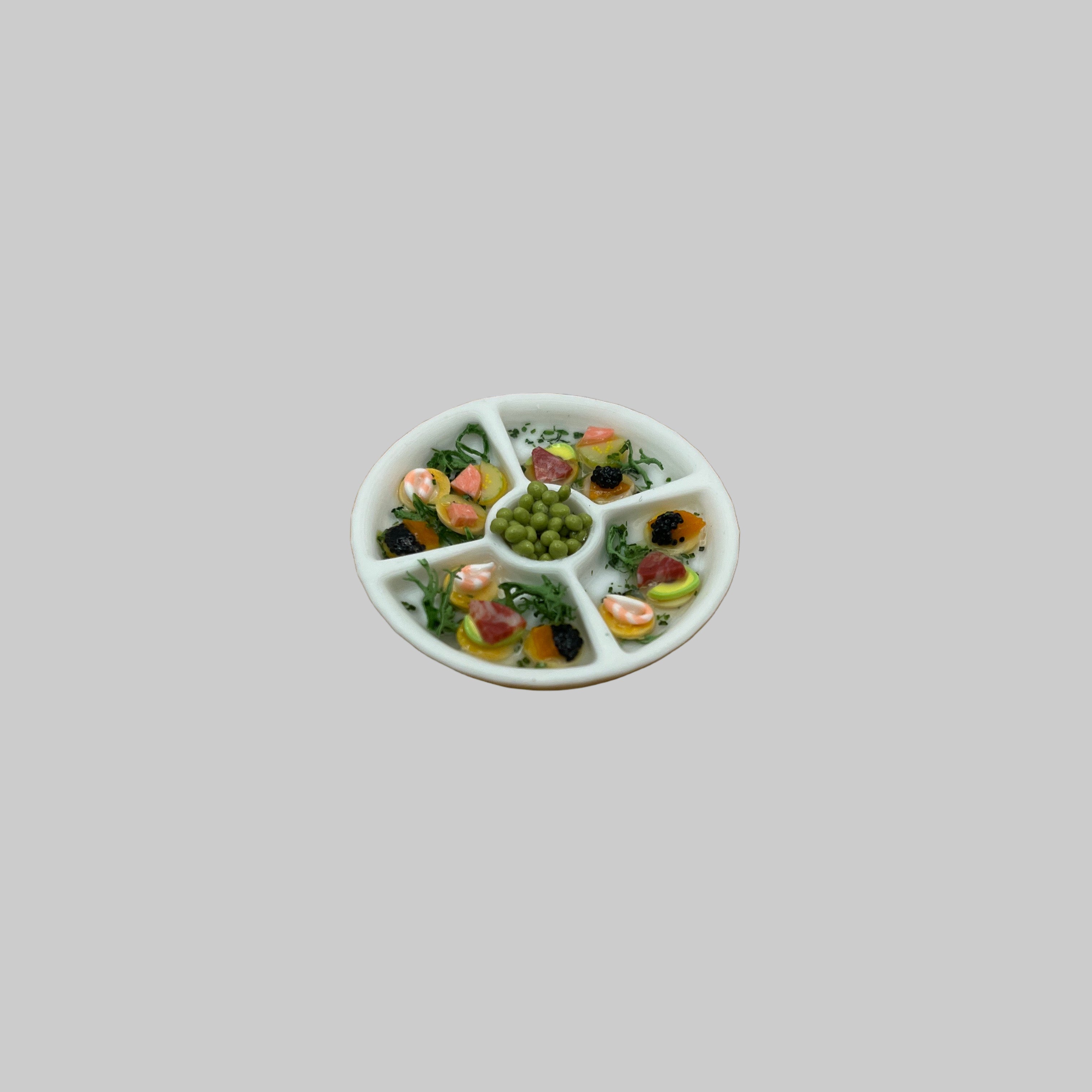 This charming canapés platter comes beautifully arranged with an assortment of delicate appetisers and glistening olives, perfect for adding sophisticated entertaining details to your miniature dining scenes. Ideal for creating elegant dinner party displays or adding authentic culinary charm to your dolls house kitchen or dining room.