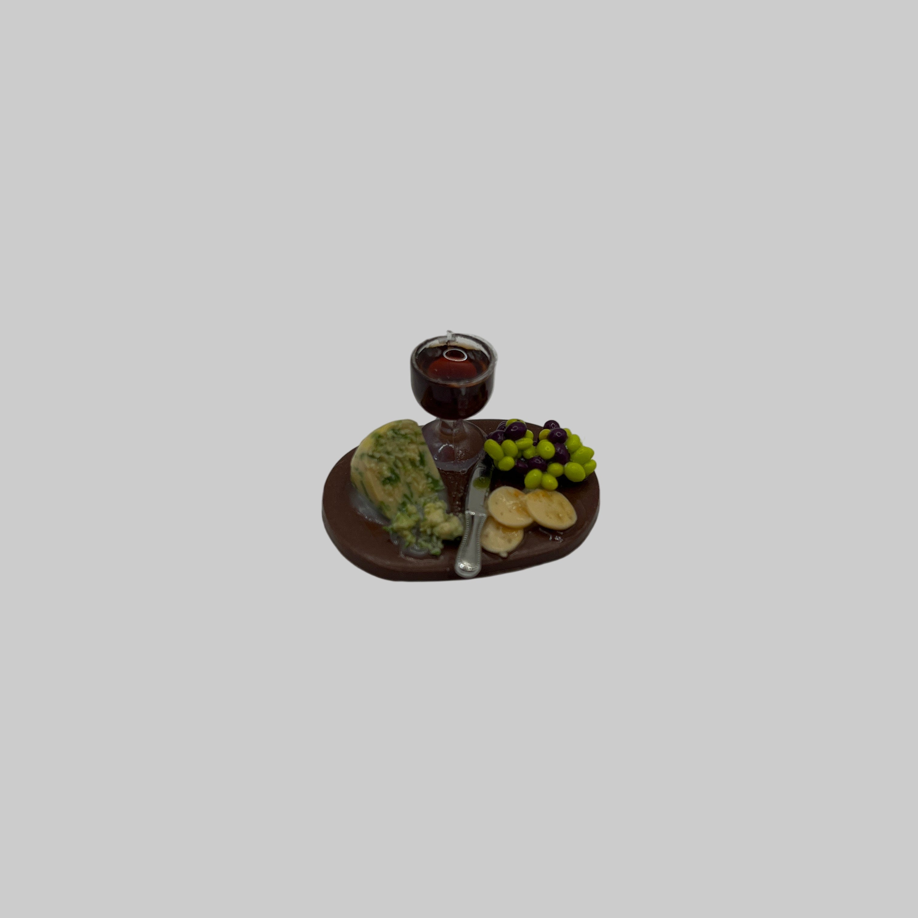 Serve up miniature charm with this delightful cheese and wine board featuring crumbly stilton. Perfectly sized for your dolls house gatherings, it adds a tasty touch of sophistication to your tiny entertaining scene.